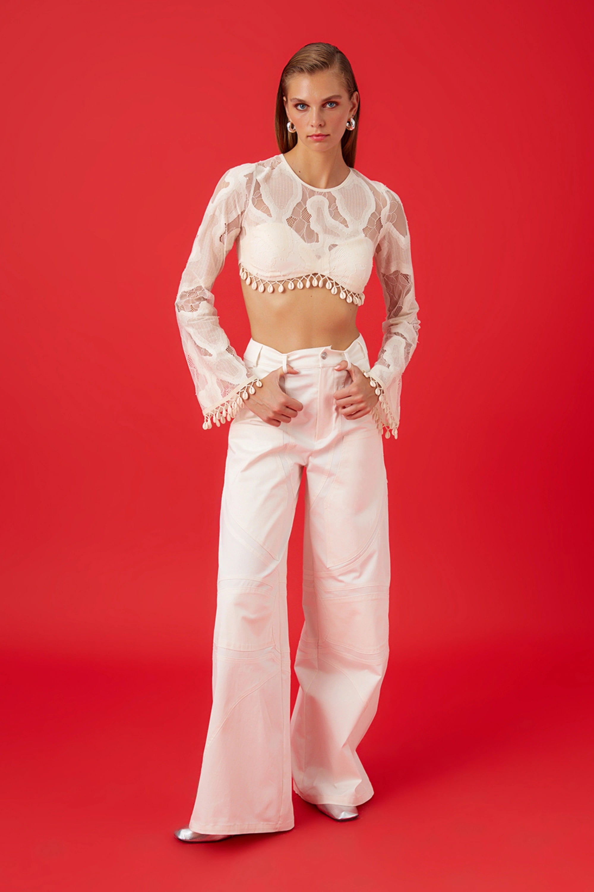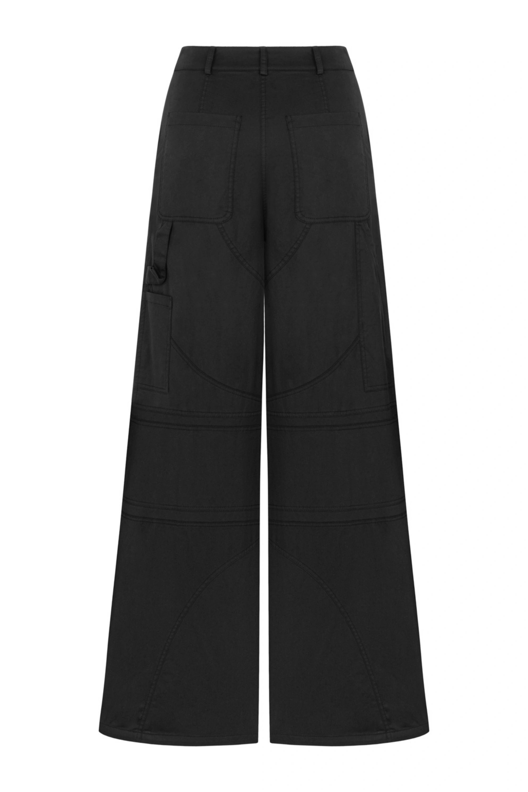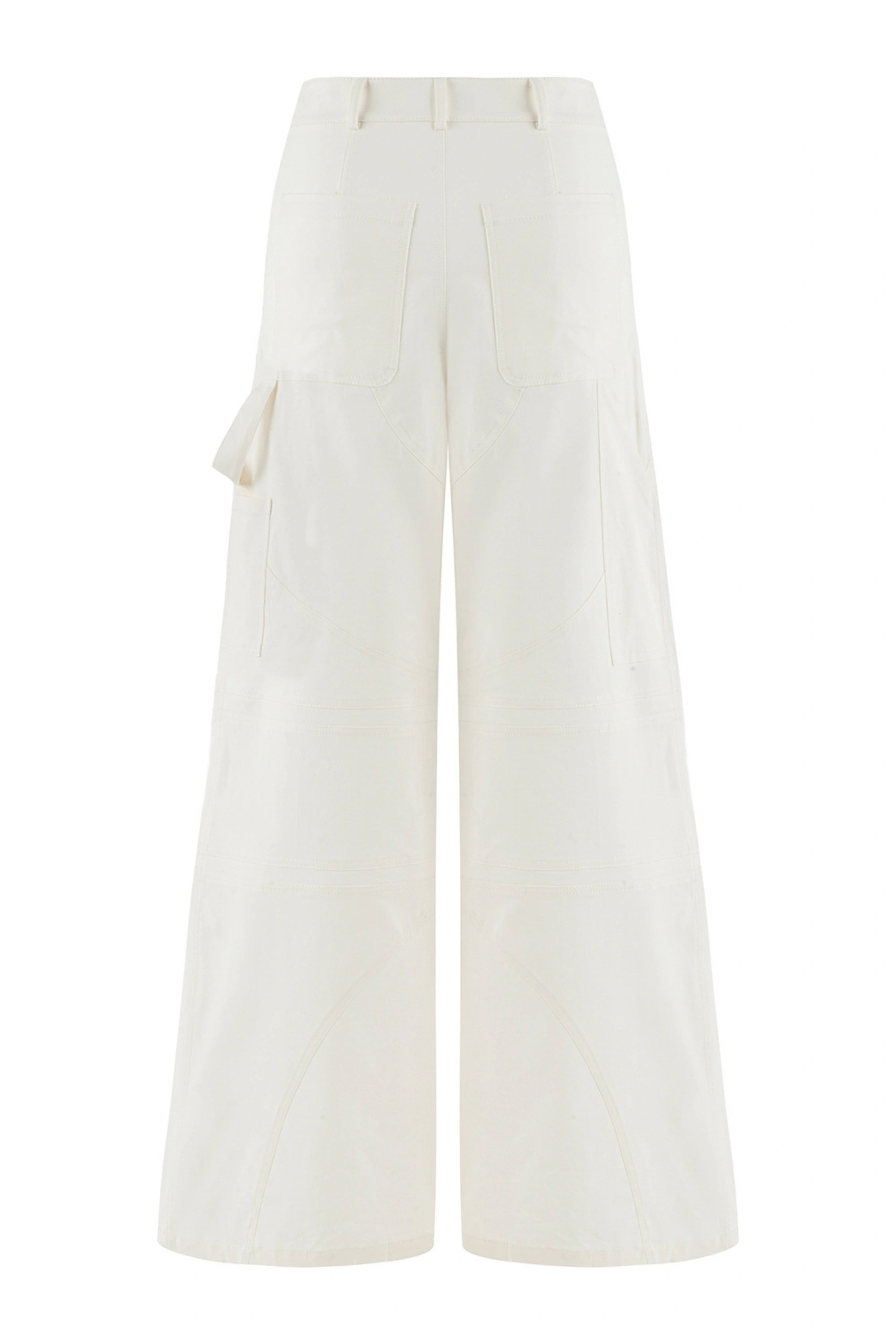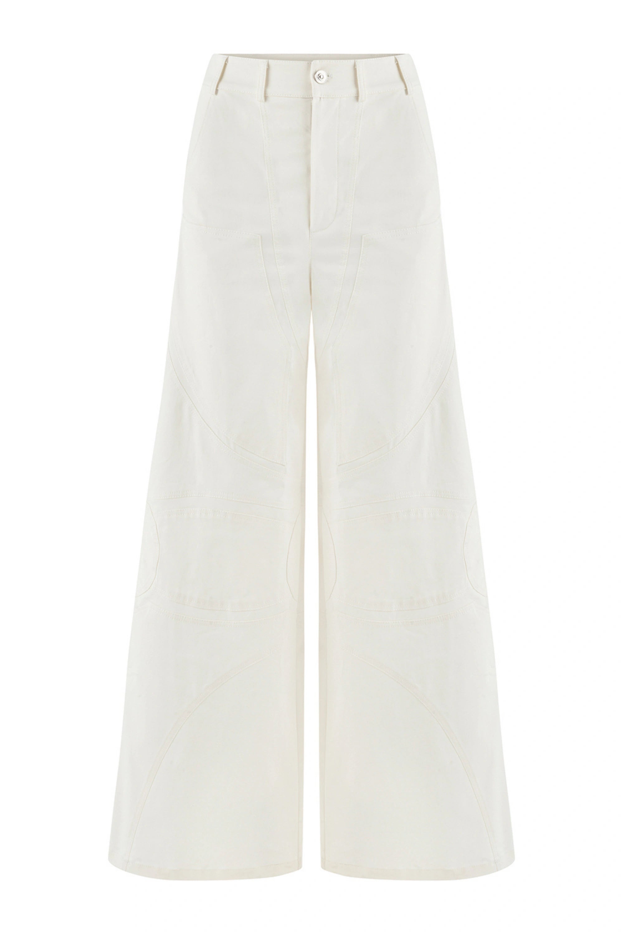 High waist pants with zipper and button closure, side pockets, wide leg and contrast topstitching.