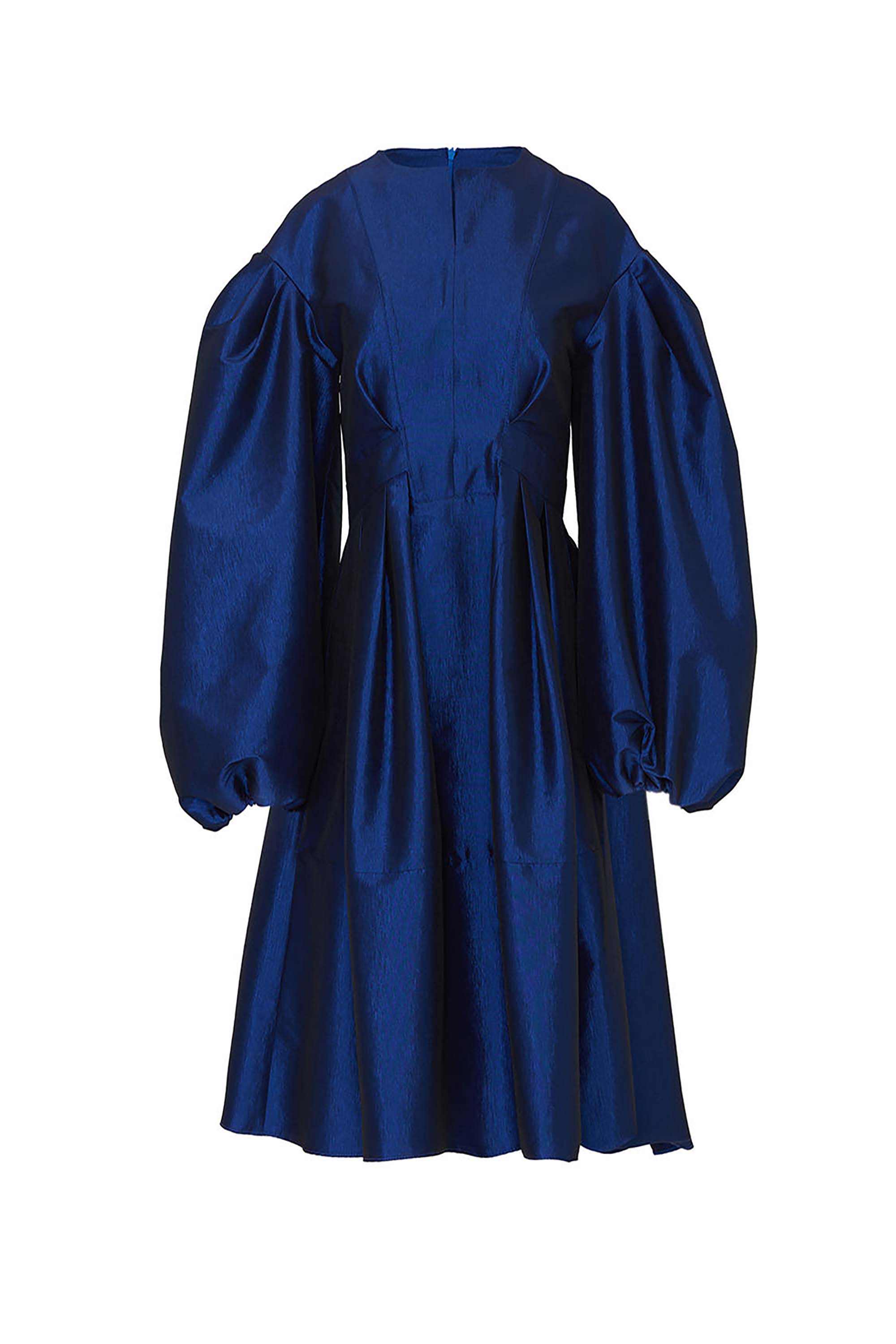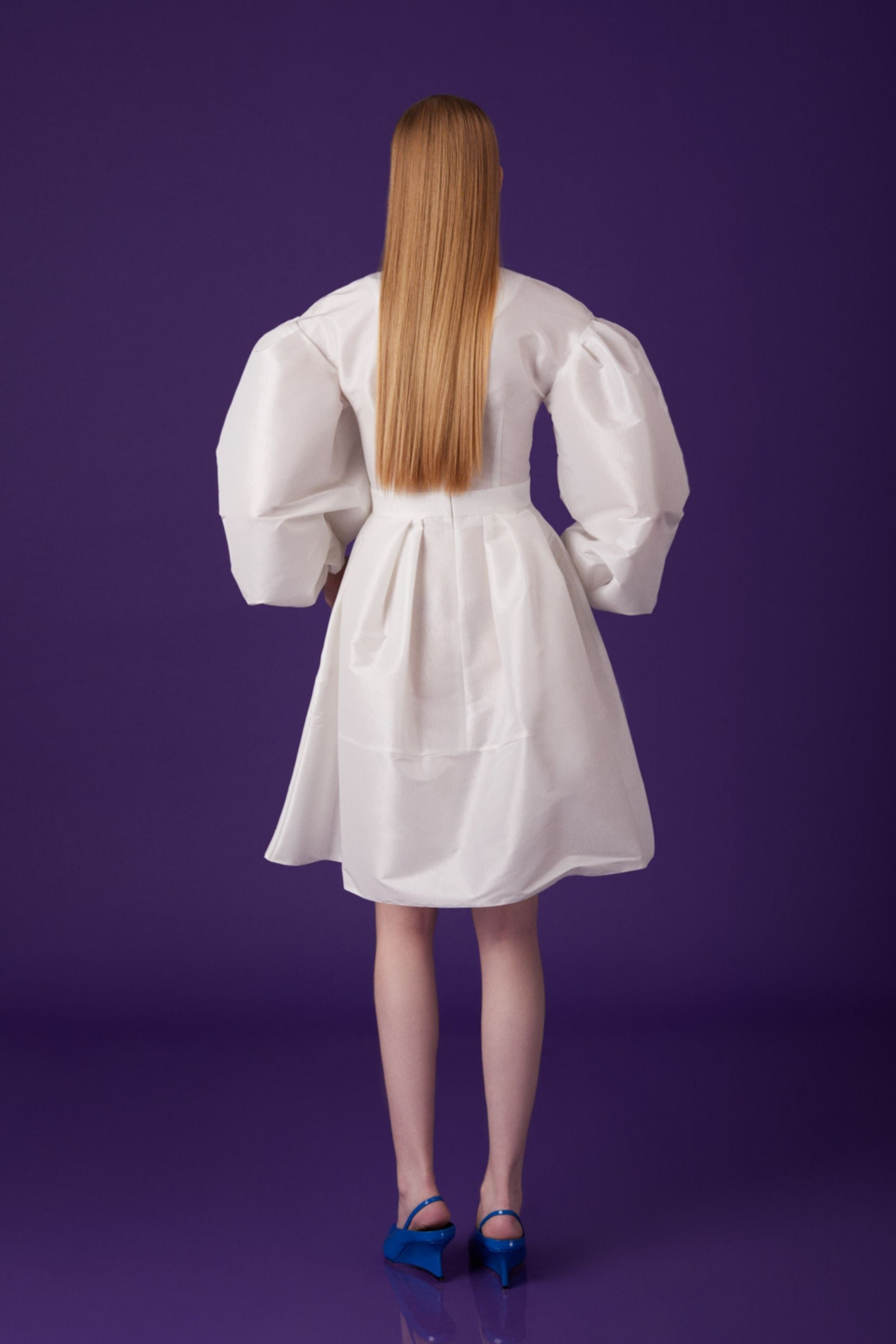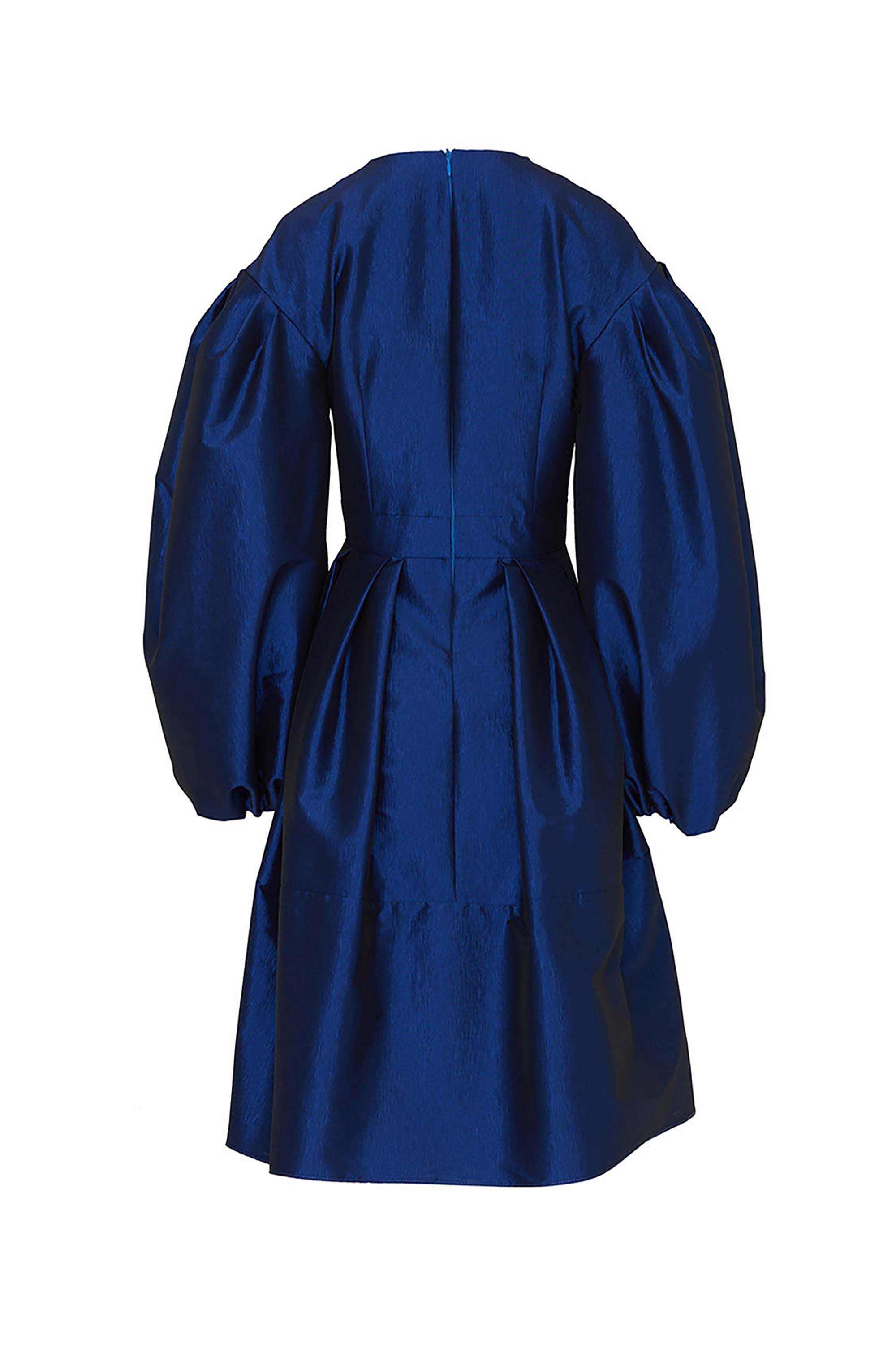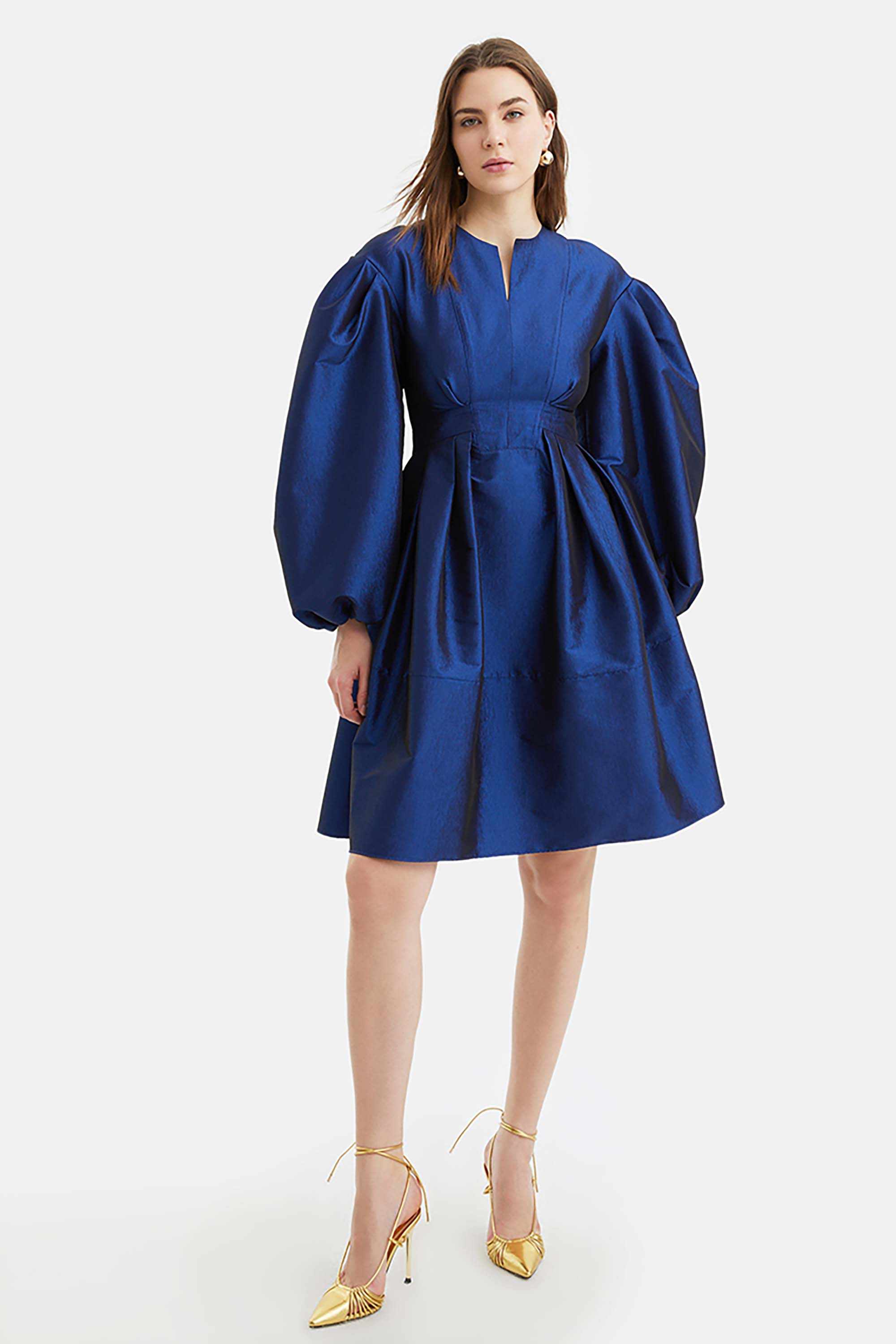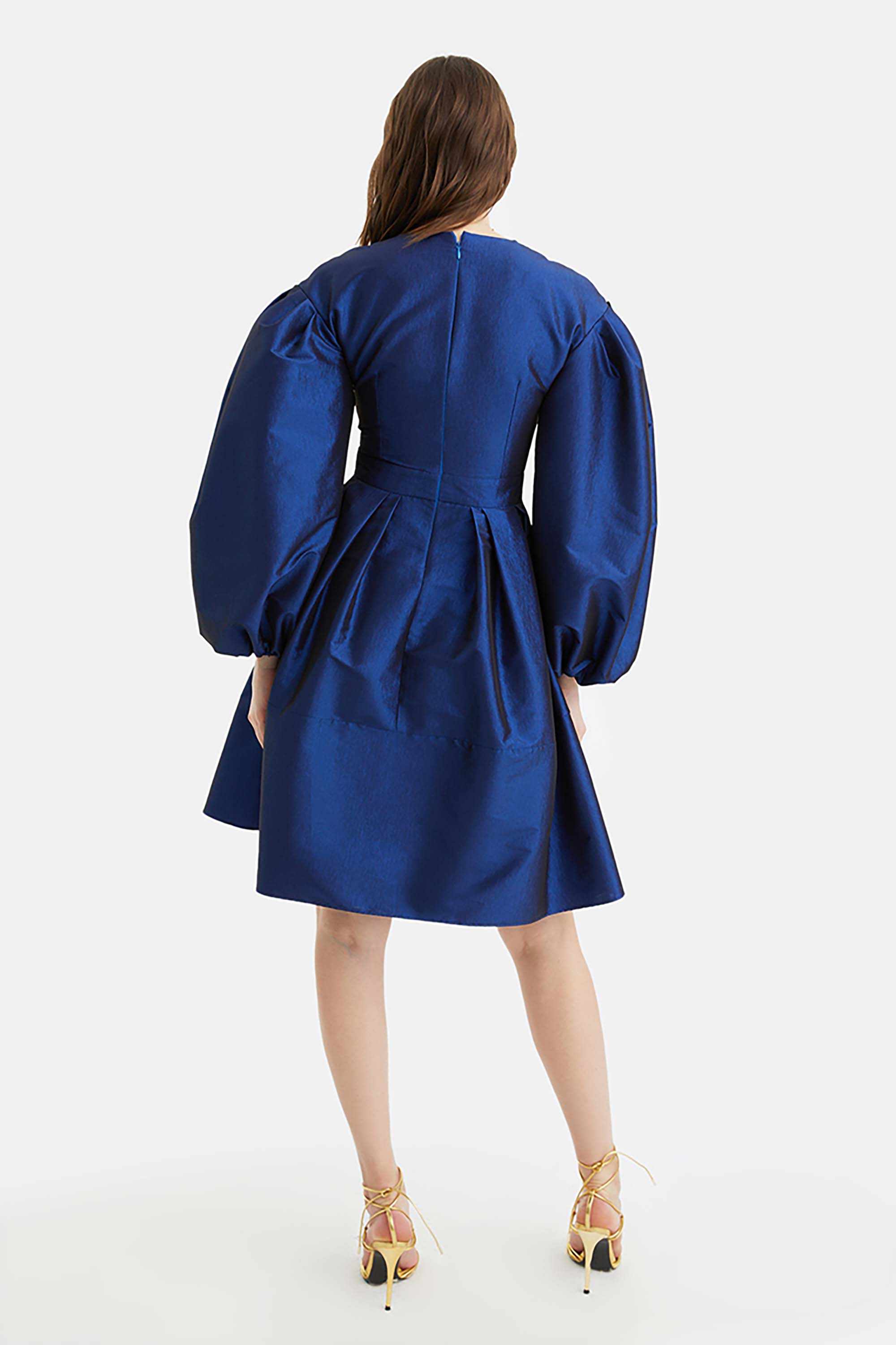 Balloon sleeve dress with elastic cuffs. Back zipper closure and front zipper detail.