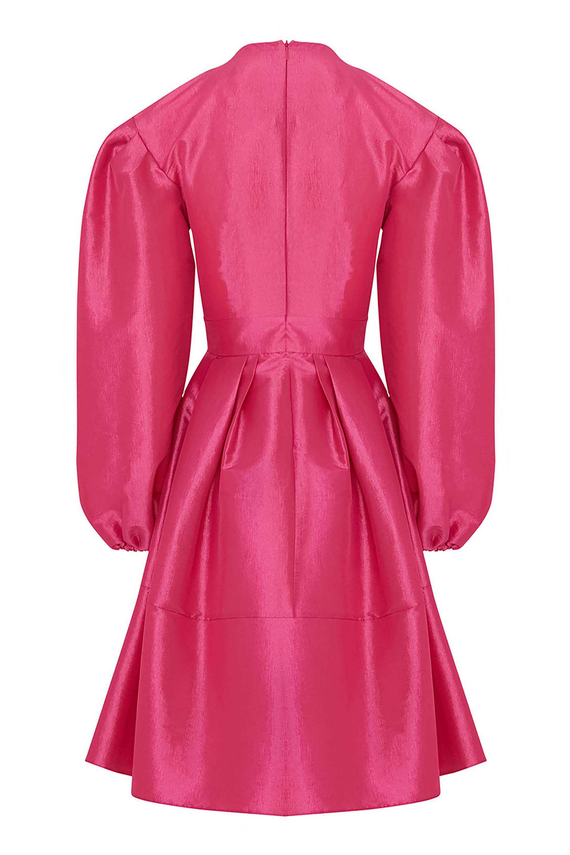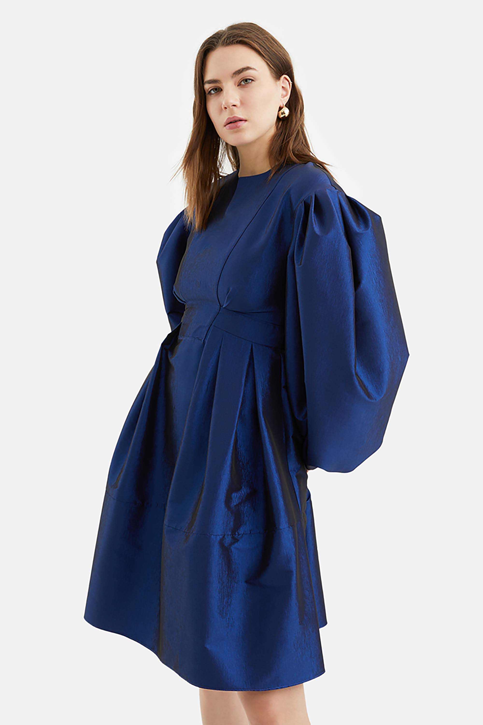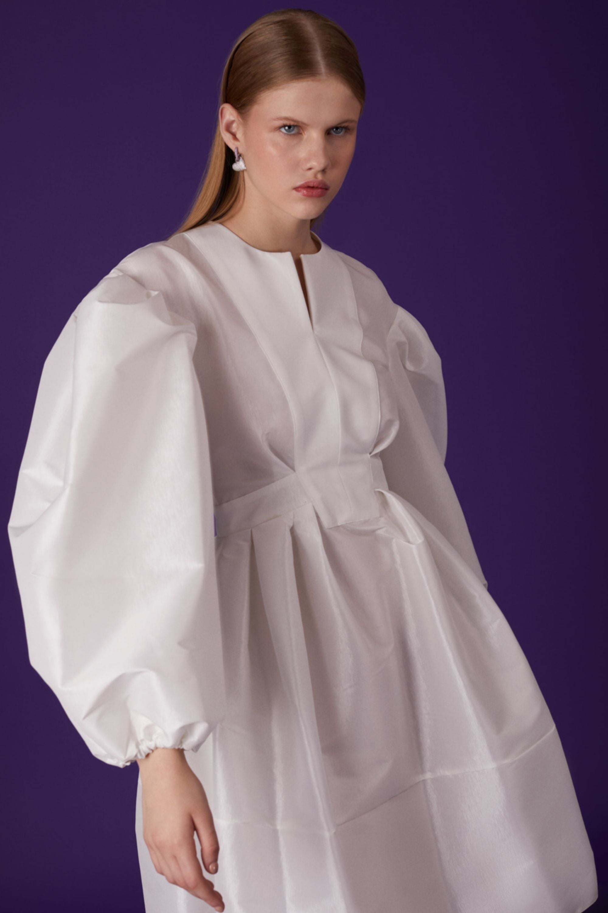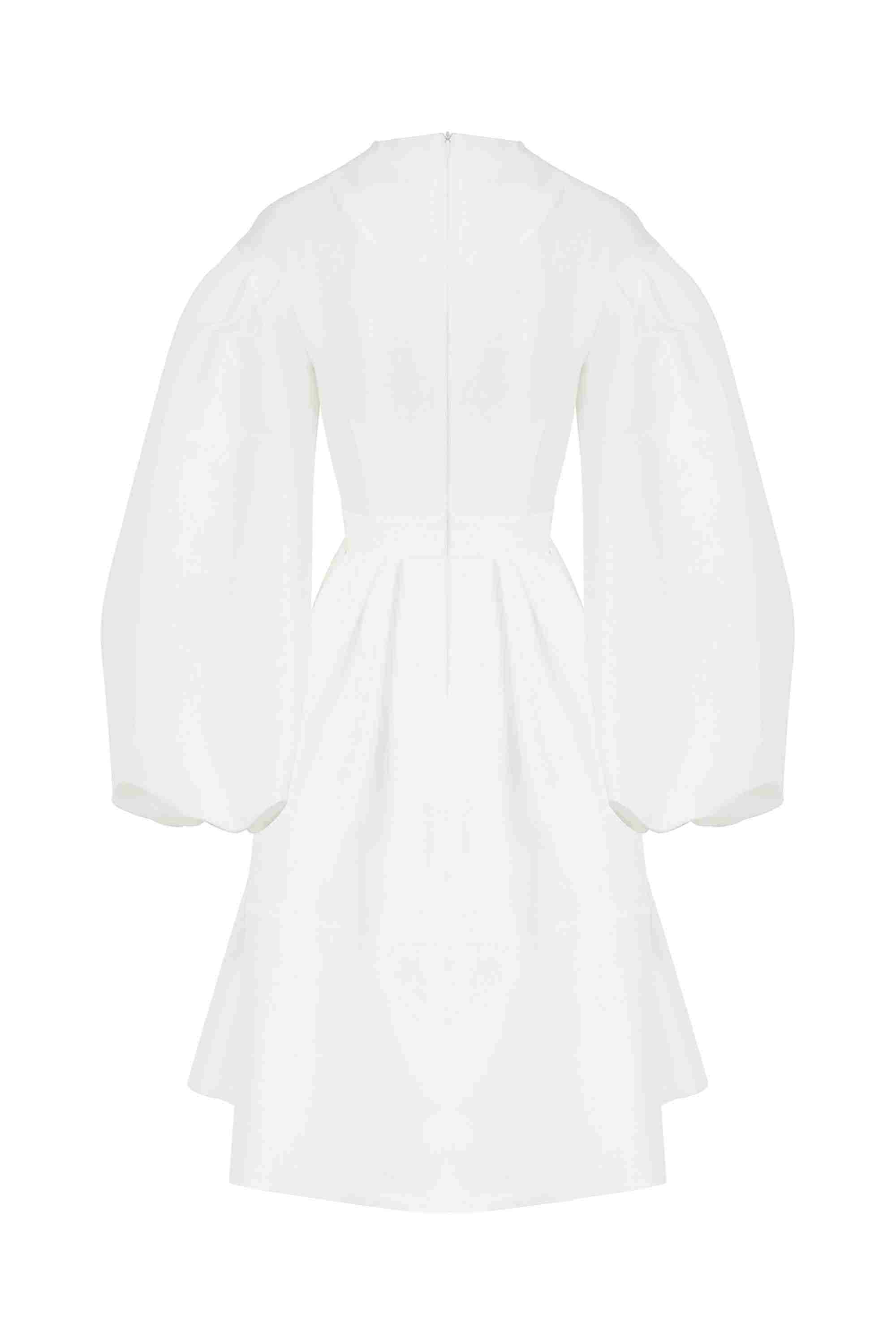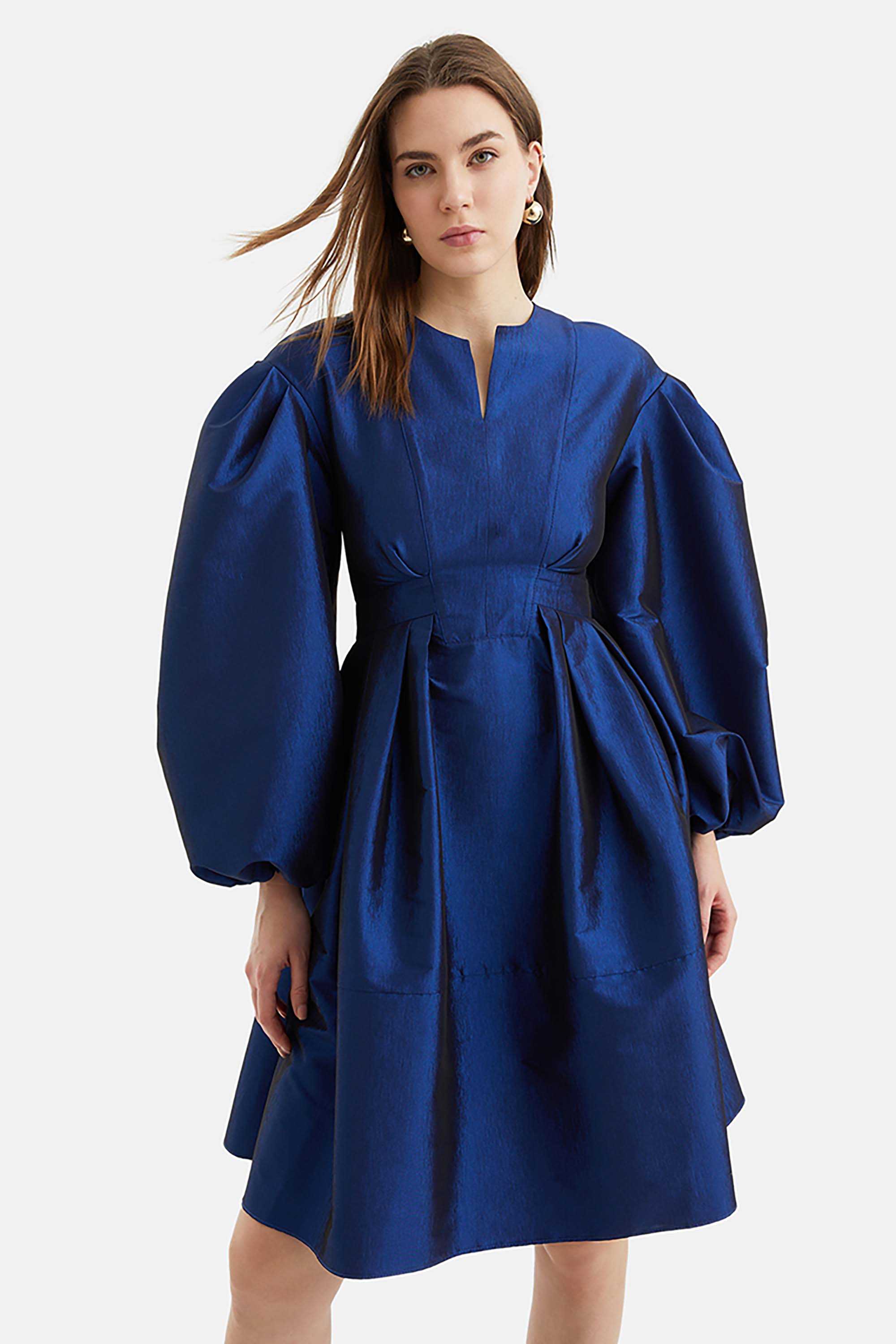 Balloon sleeve dress with elastic cuffs. Back zipper closure and front zipper detail.