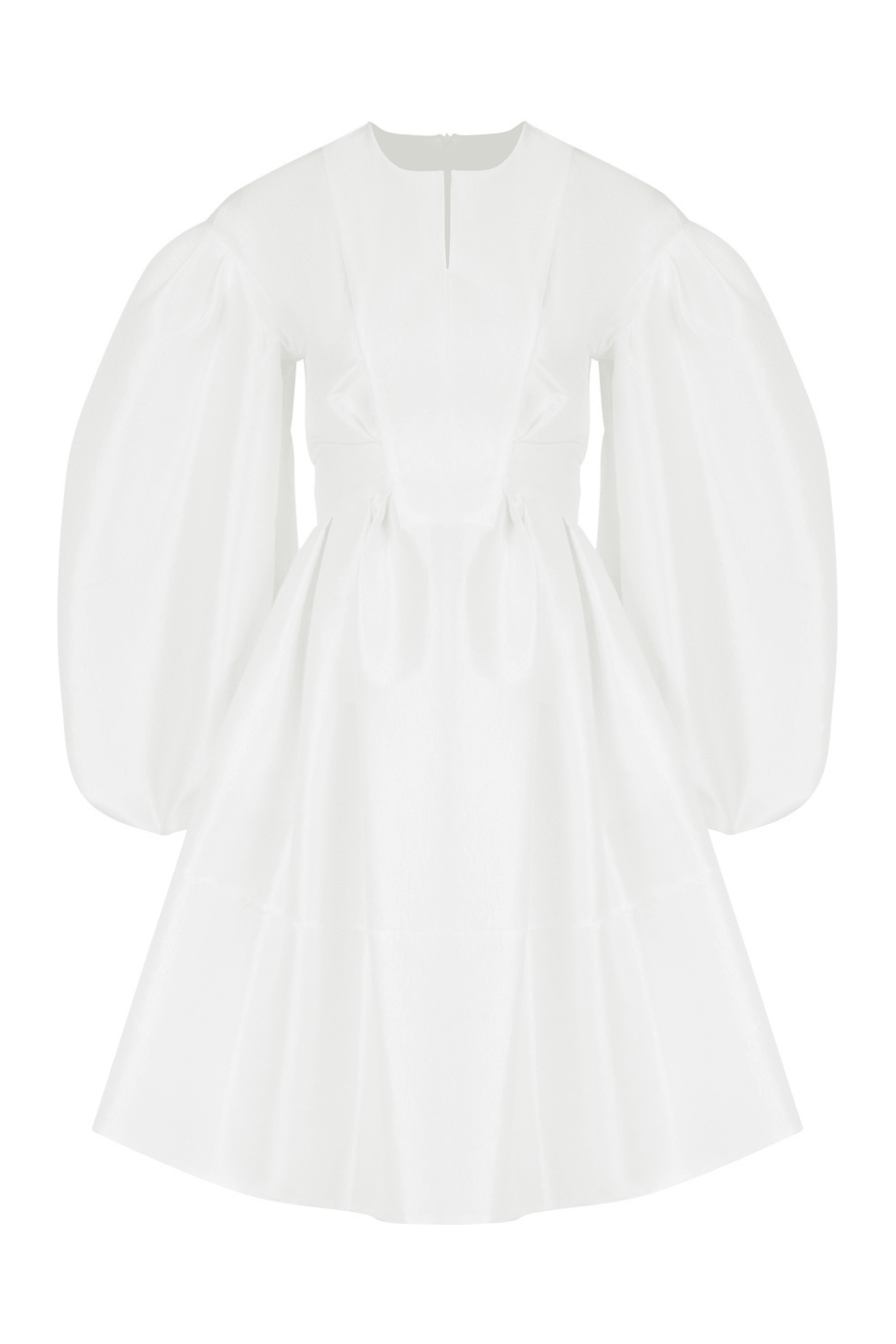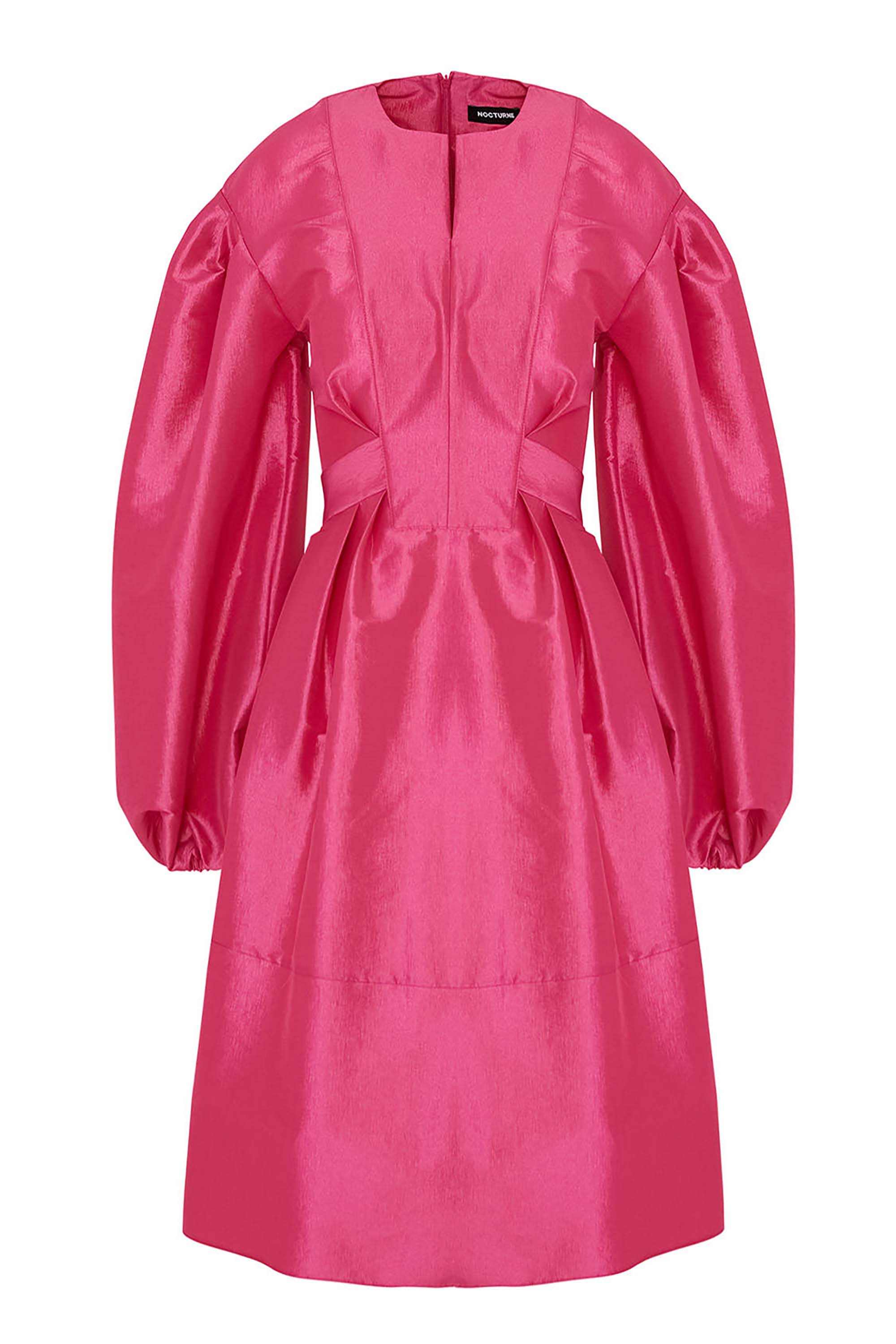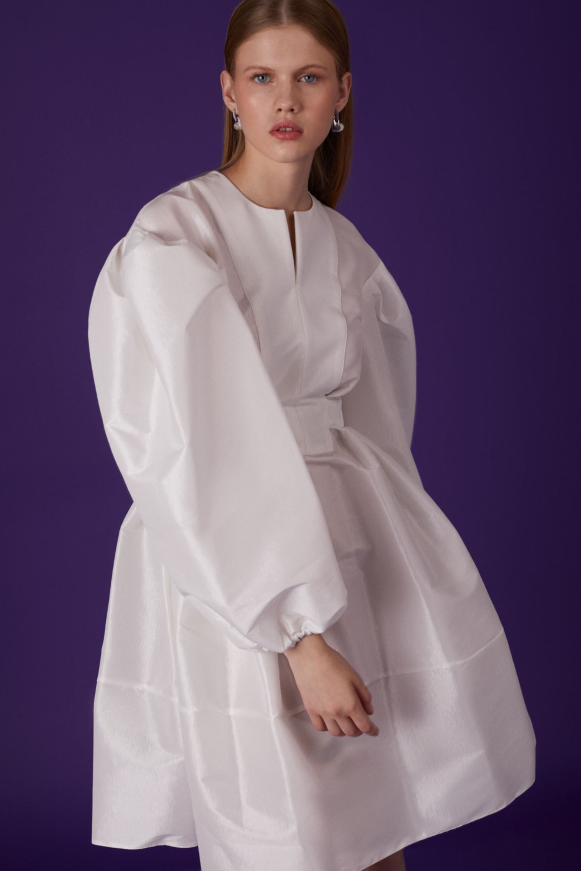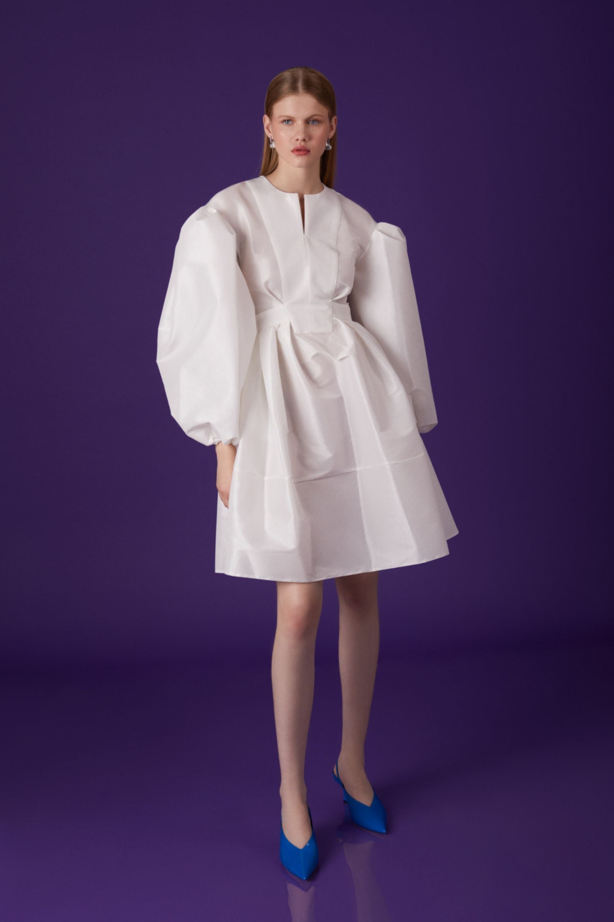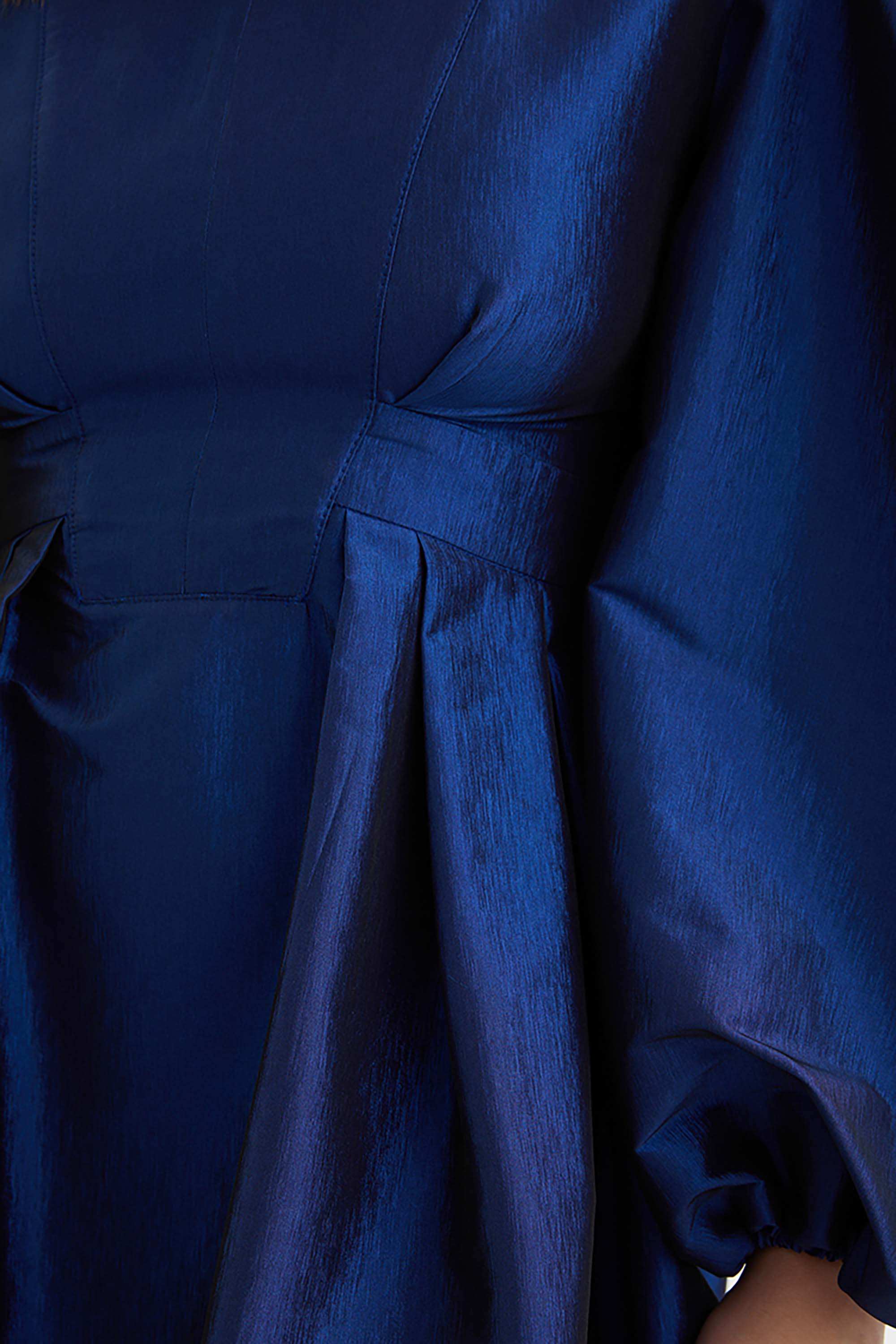 Balloon sleeve dress with elastic cuffs. Back zipper closure and front zipper detail.