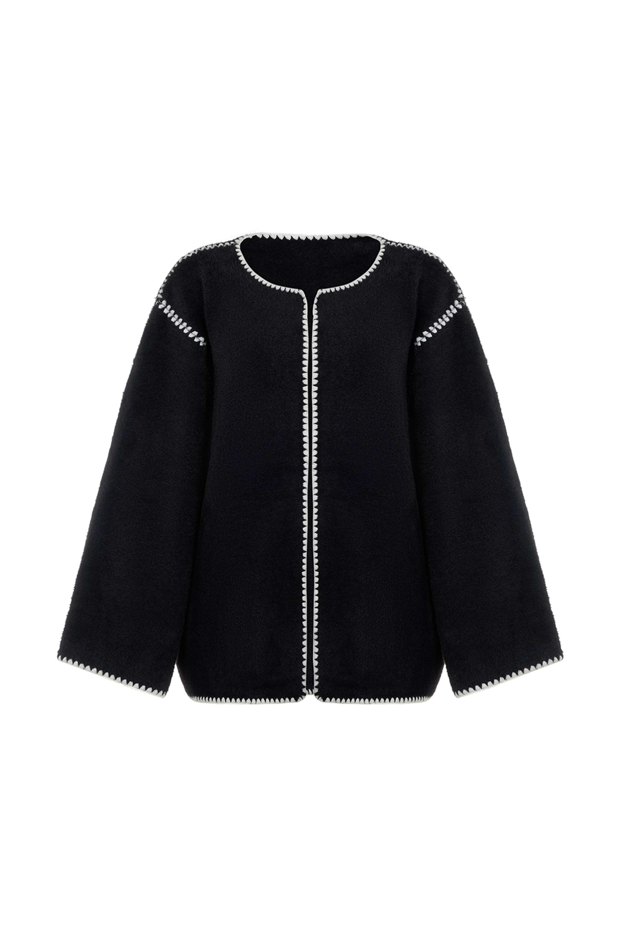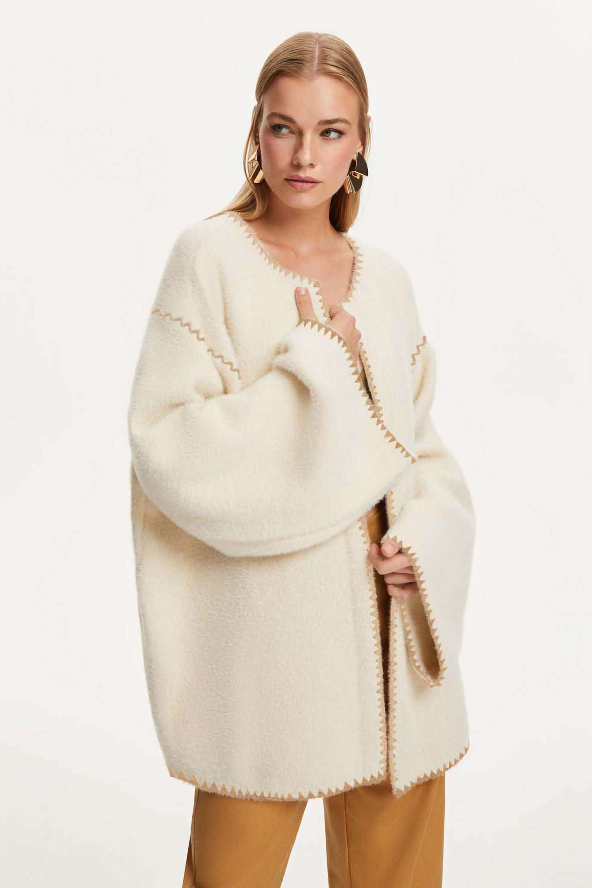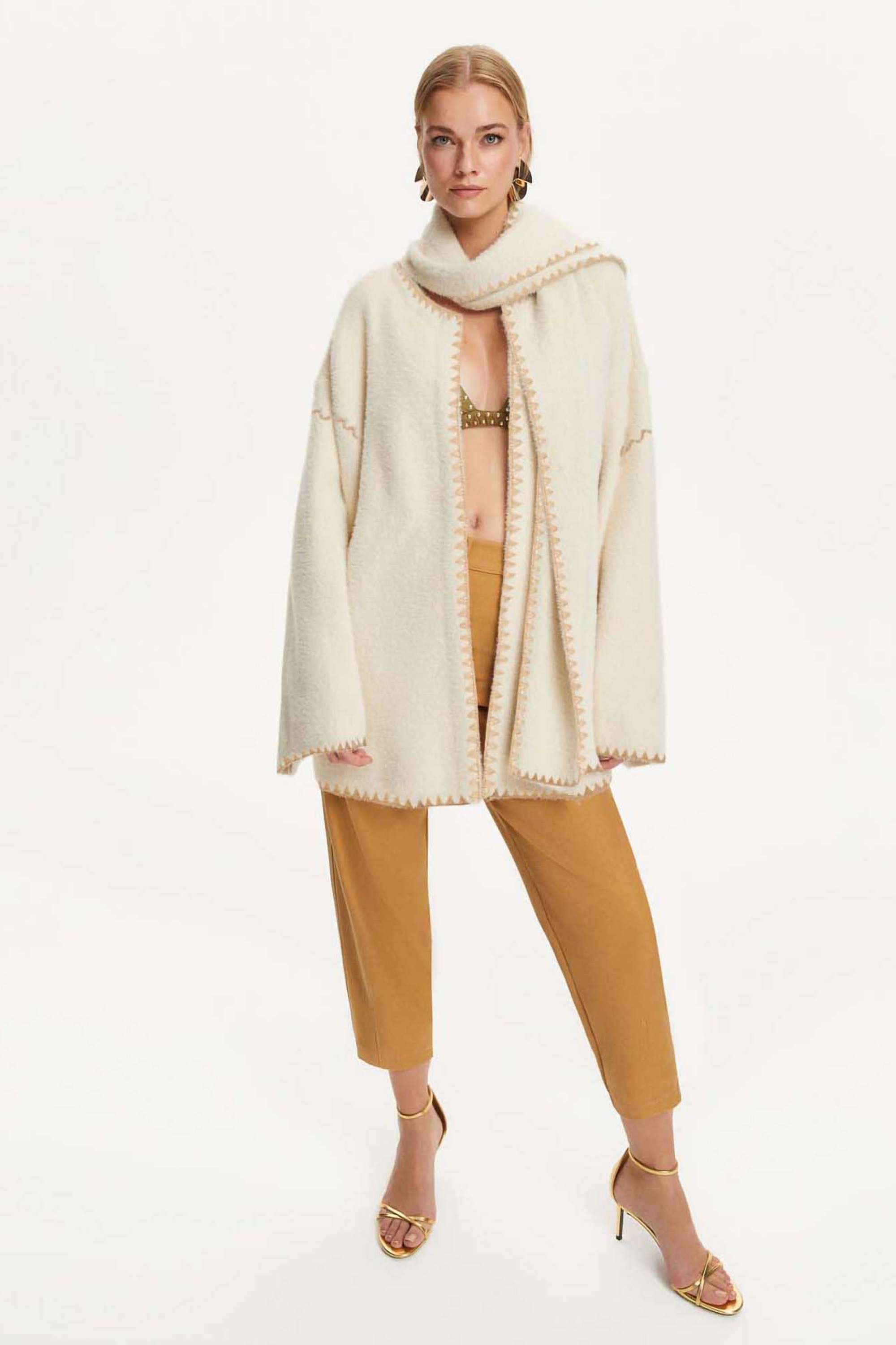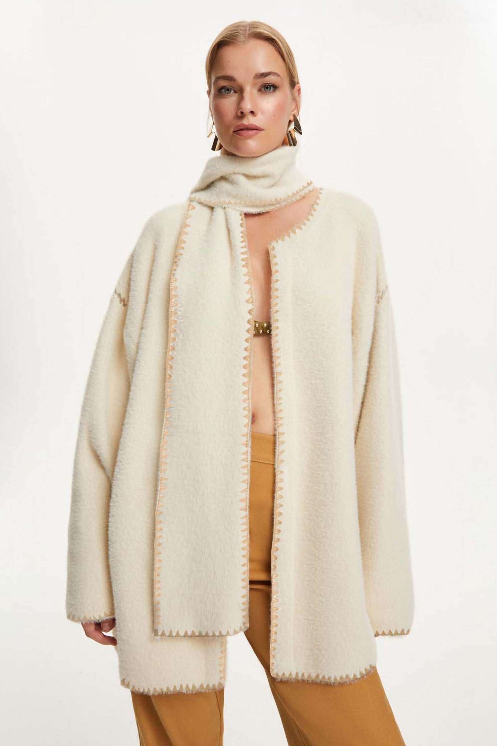 Soft textured knit cardigan with a round neckline, long sleeves, detachable scarf.