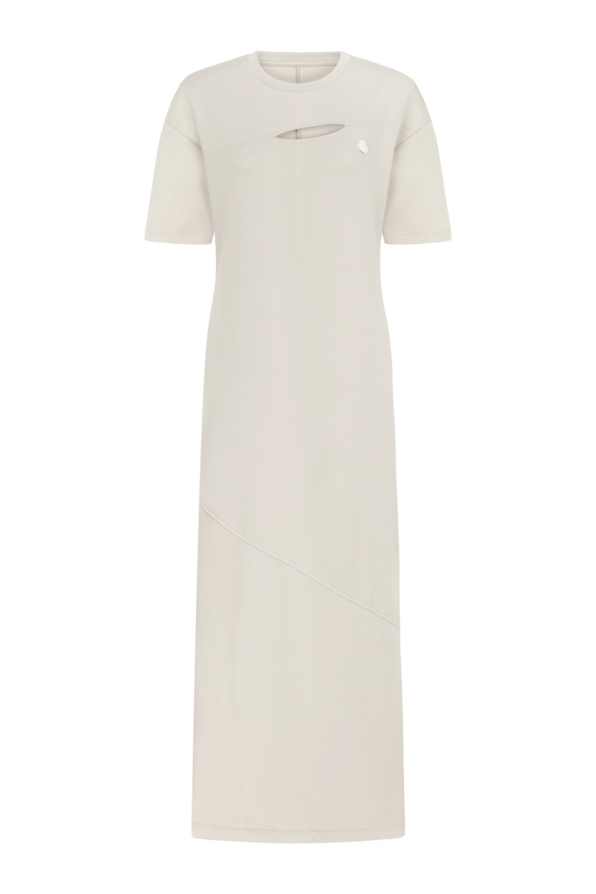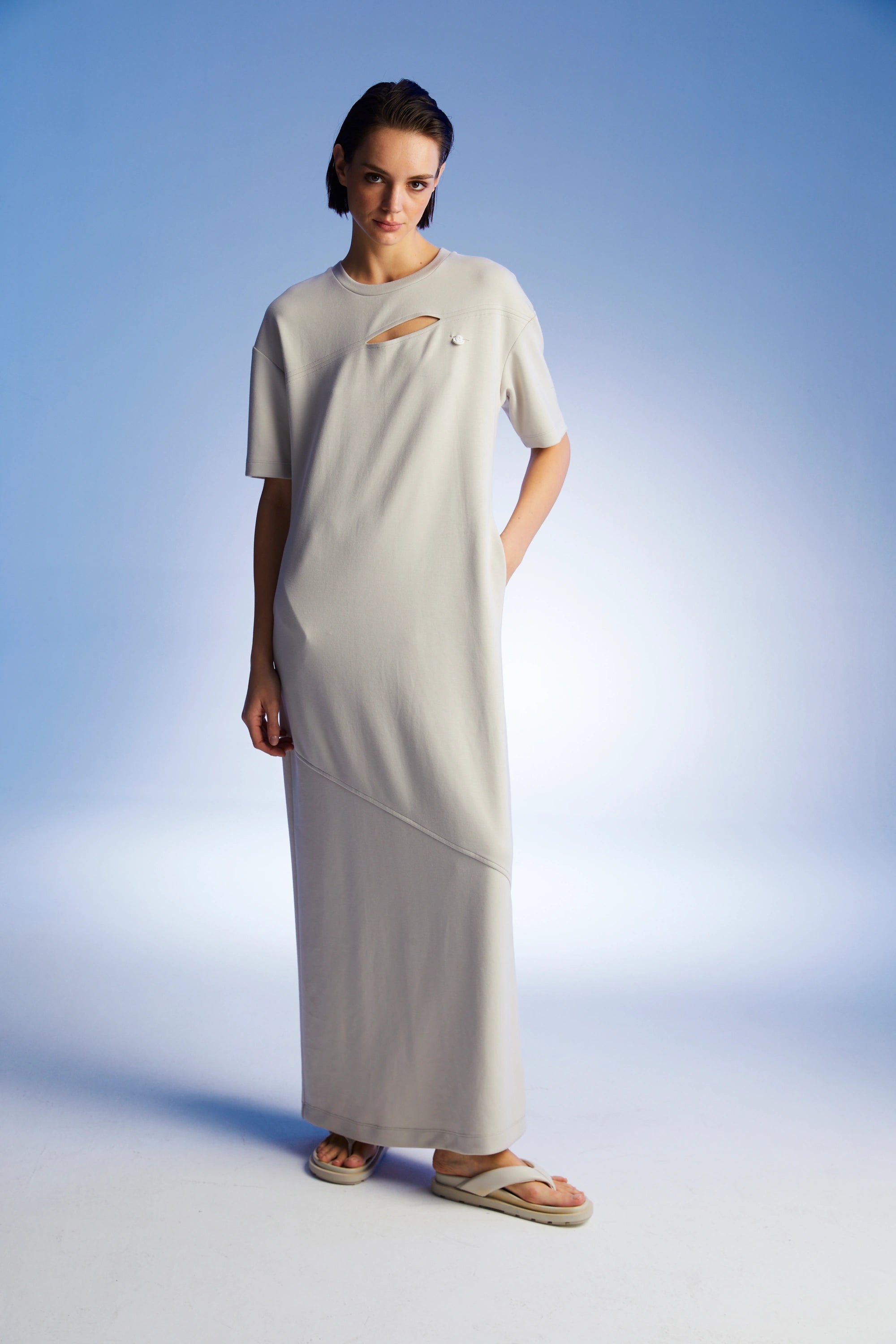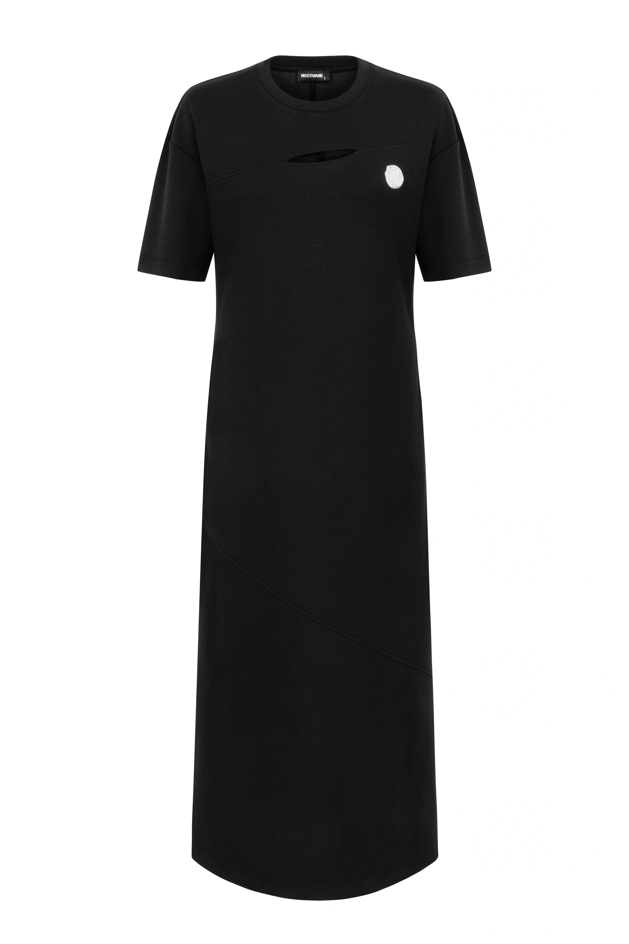This long dress from Nocturne features a crew neck and short sleeves, designed to embody modern elegance with a subtle cutout detail. Perfect for a variety of events, it offers a refined silhouette that suits any occasion this season.