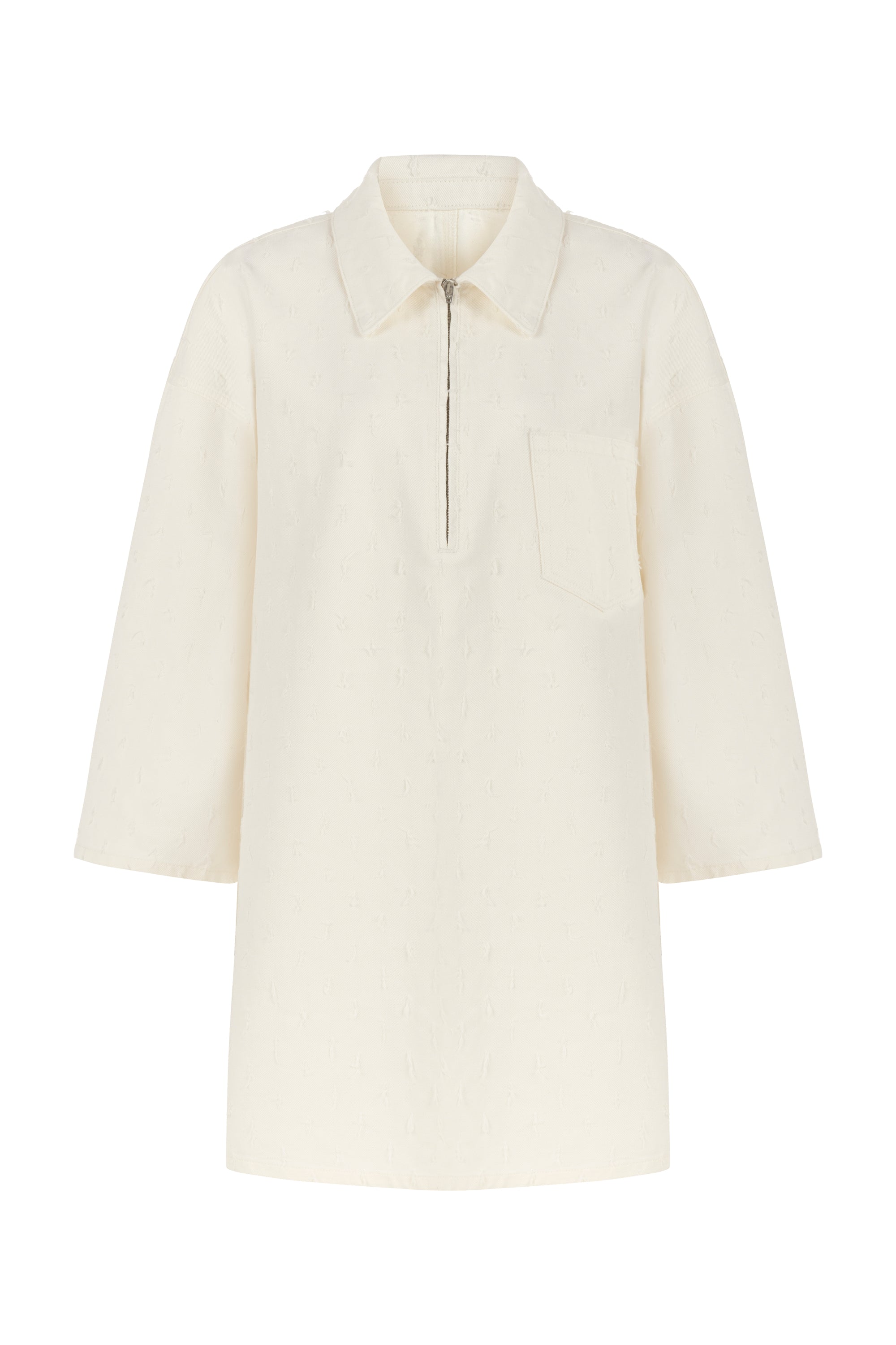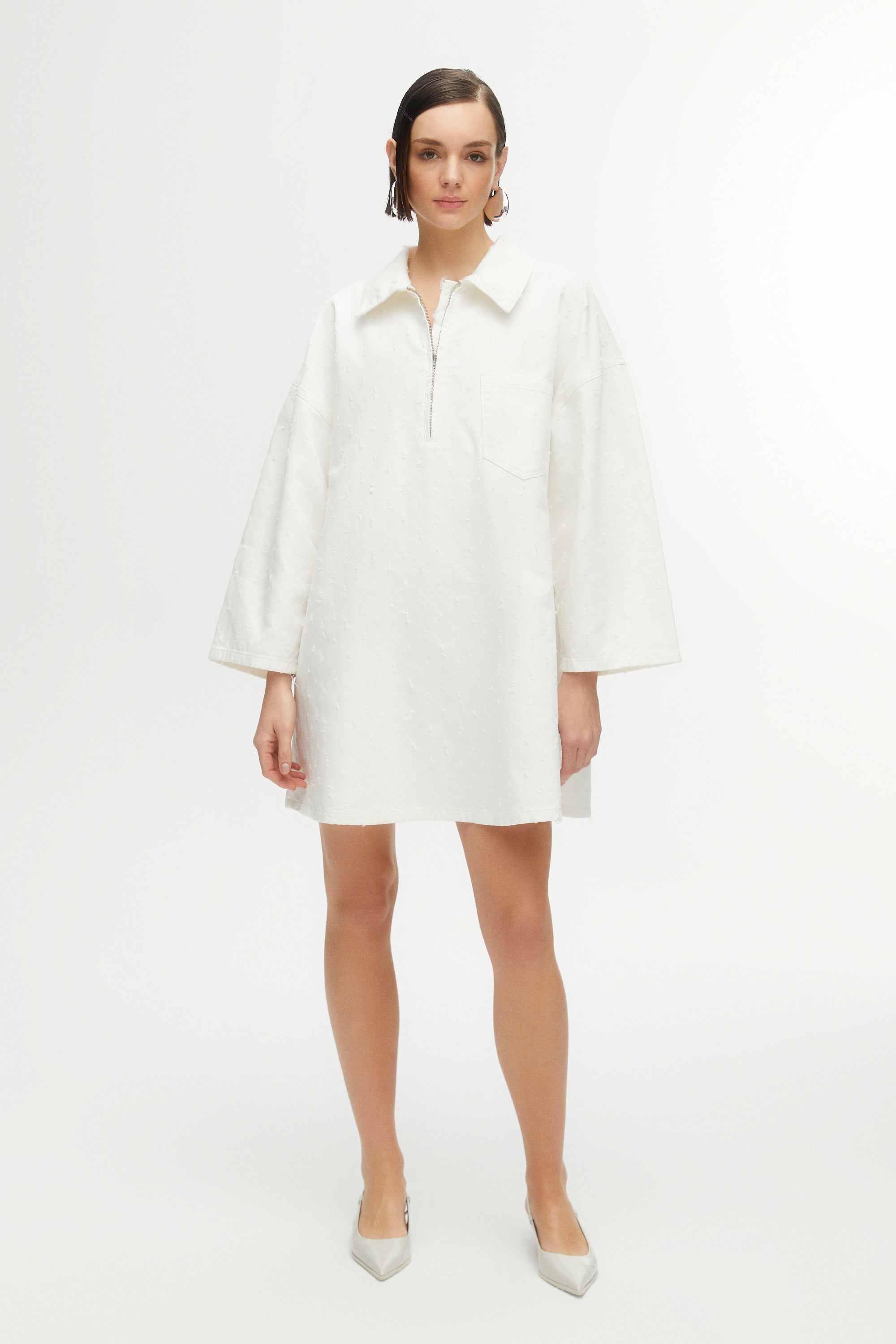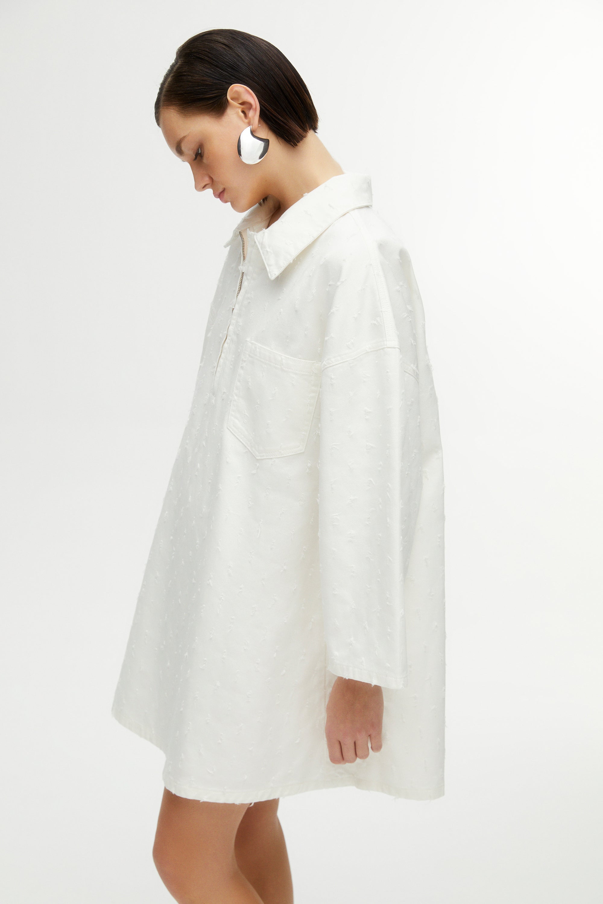 Oversized denim mini dress with shirt collar, front zipper and front pockets.