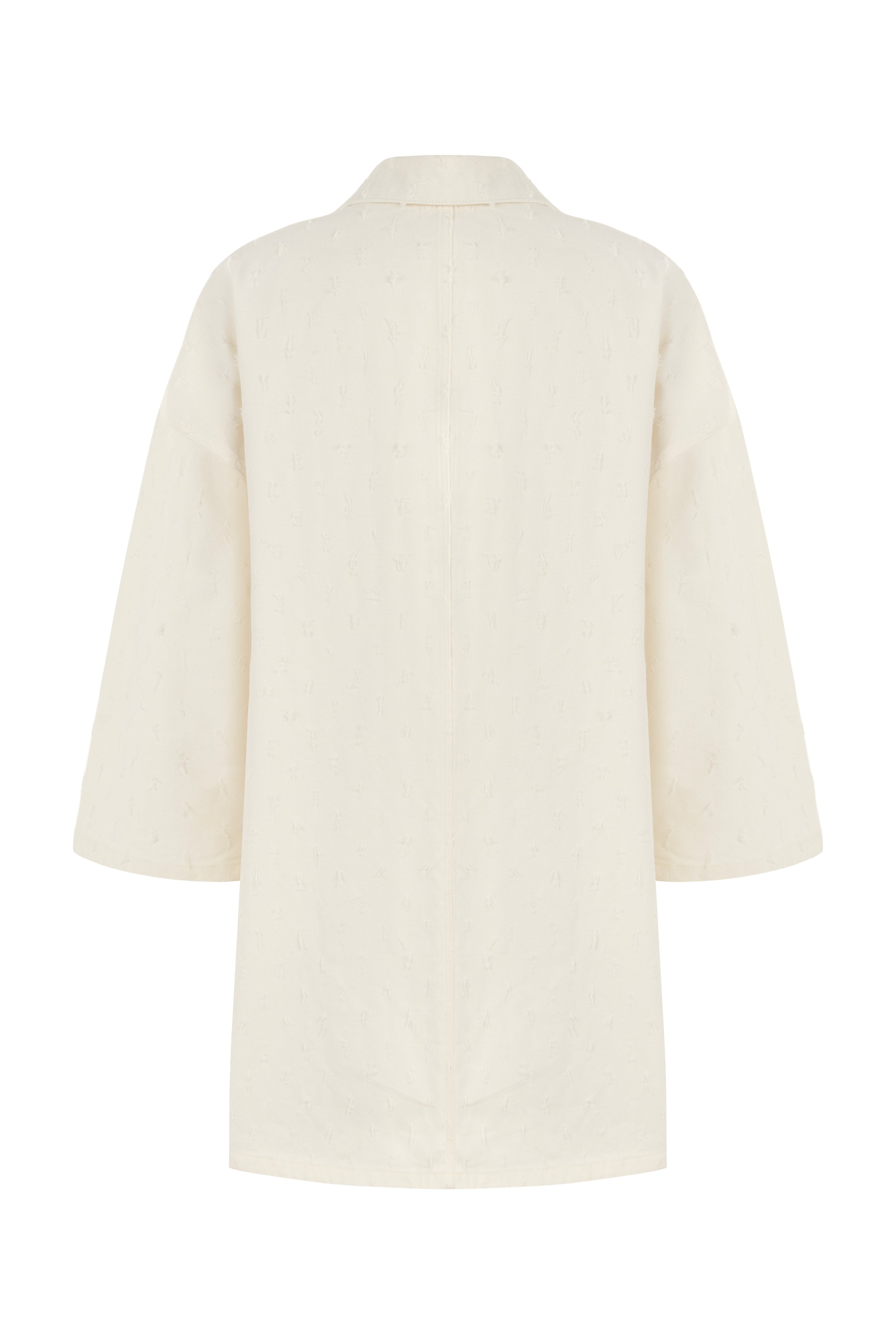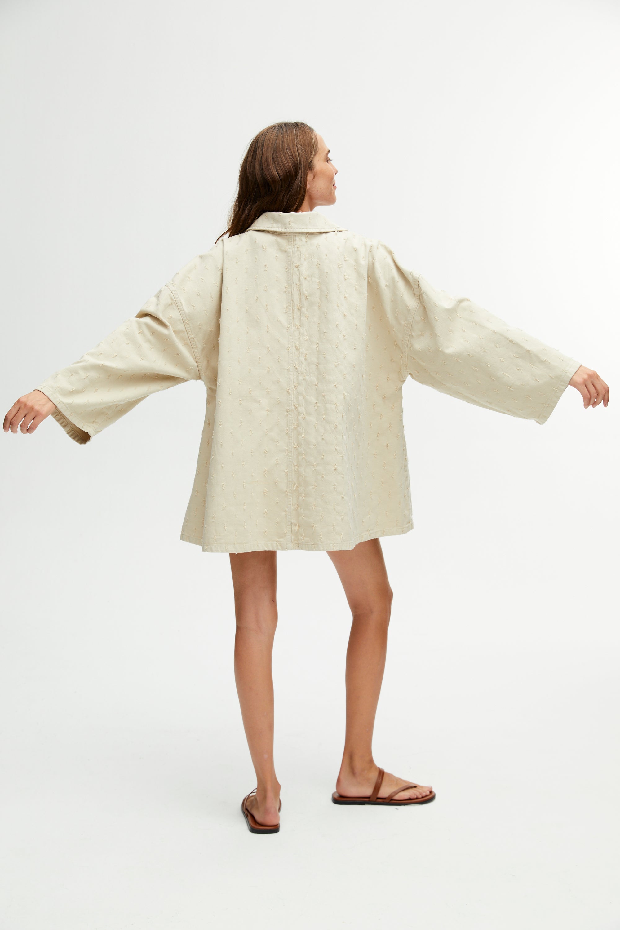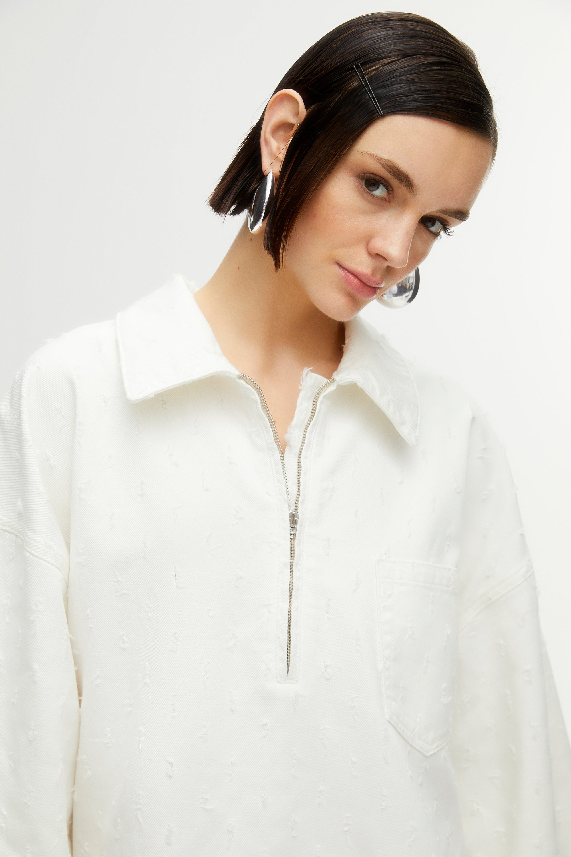Oversized denim mini dress with shirt collar, front zipper and front pockets.