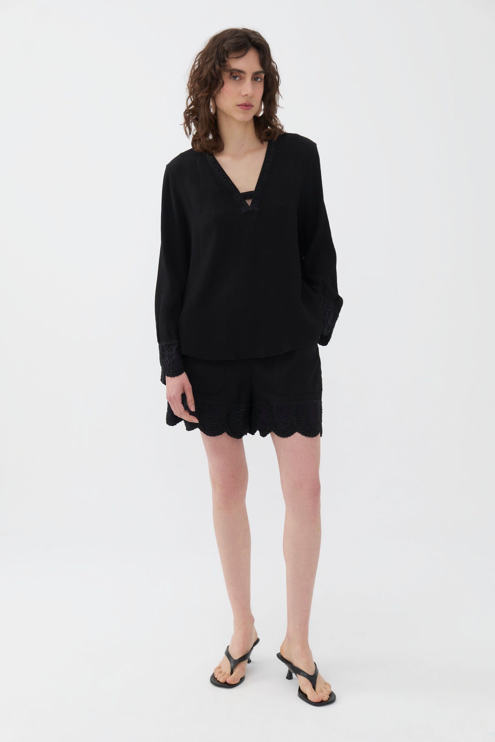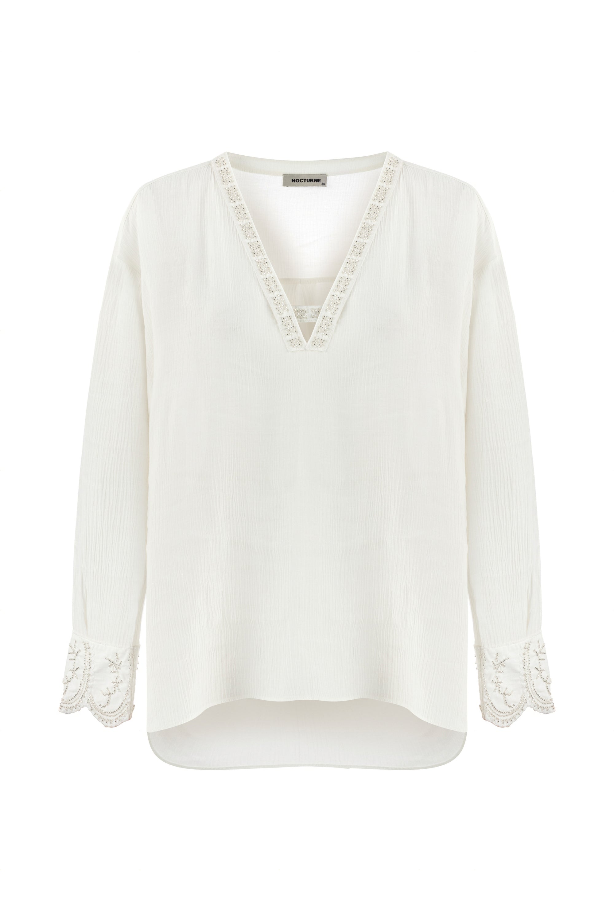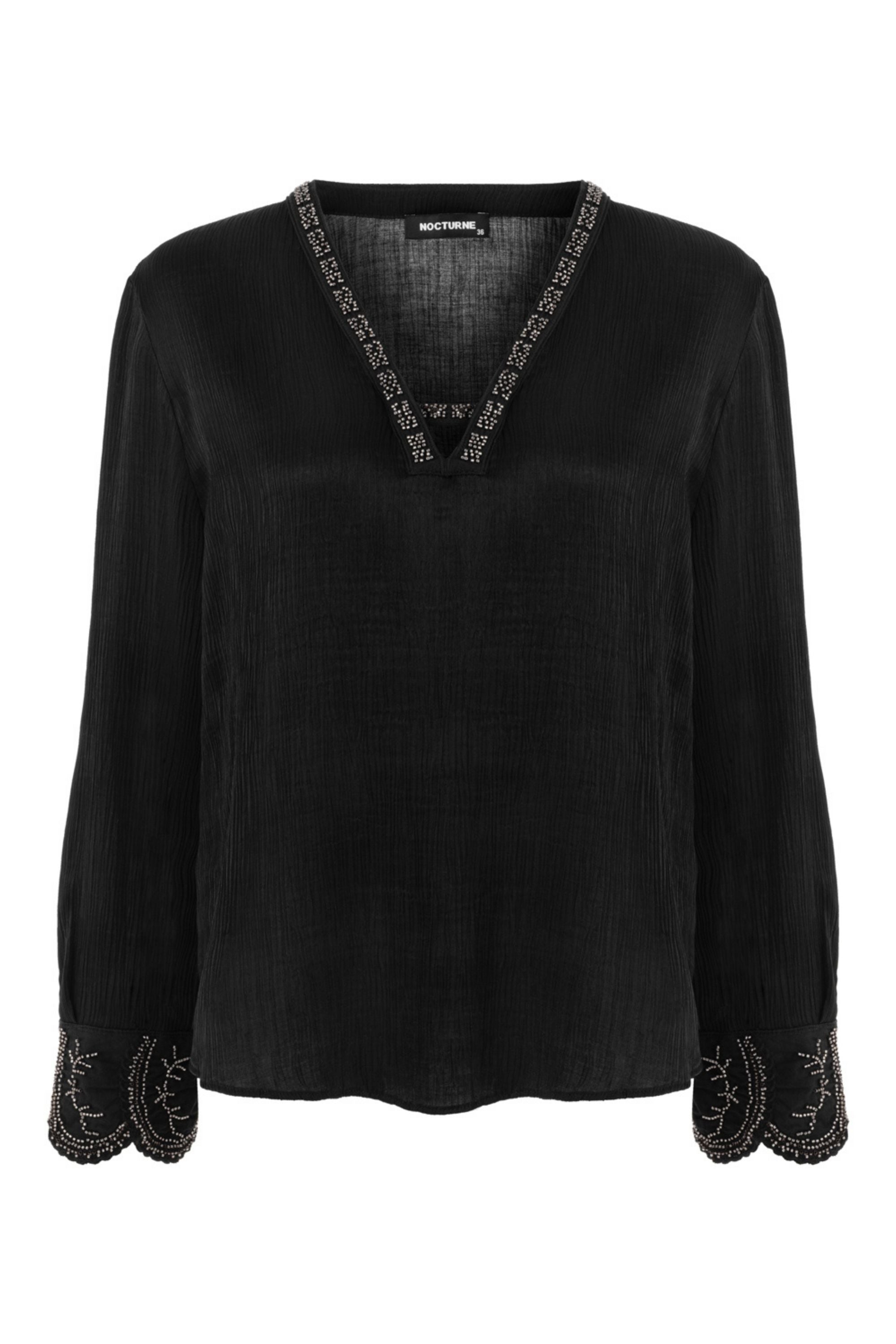 The Stone Embroidered Blouse pairs effortlessly with jeans, joggers, shorts, or skinny pants. It complements skinny jeans or stylish shorts when matched with high heels. Featuring a V-neck and long, flowing sleeves, this blouse is elegantly detailed with stone embroidery along the collar and sleeve hems.